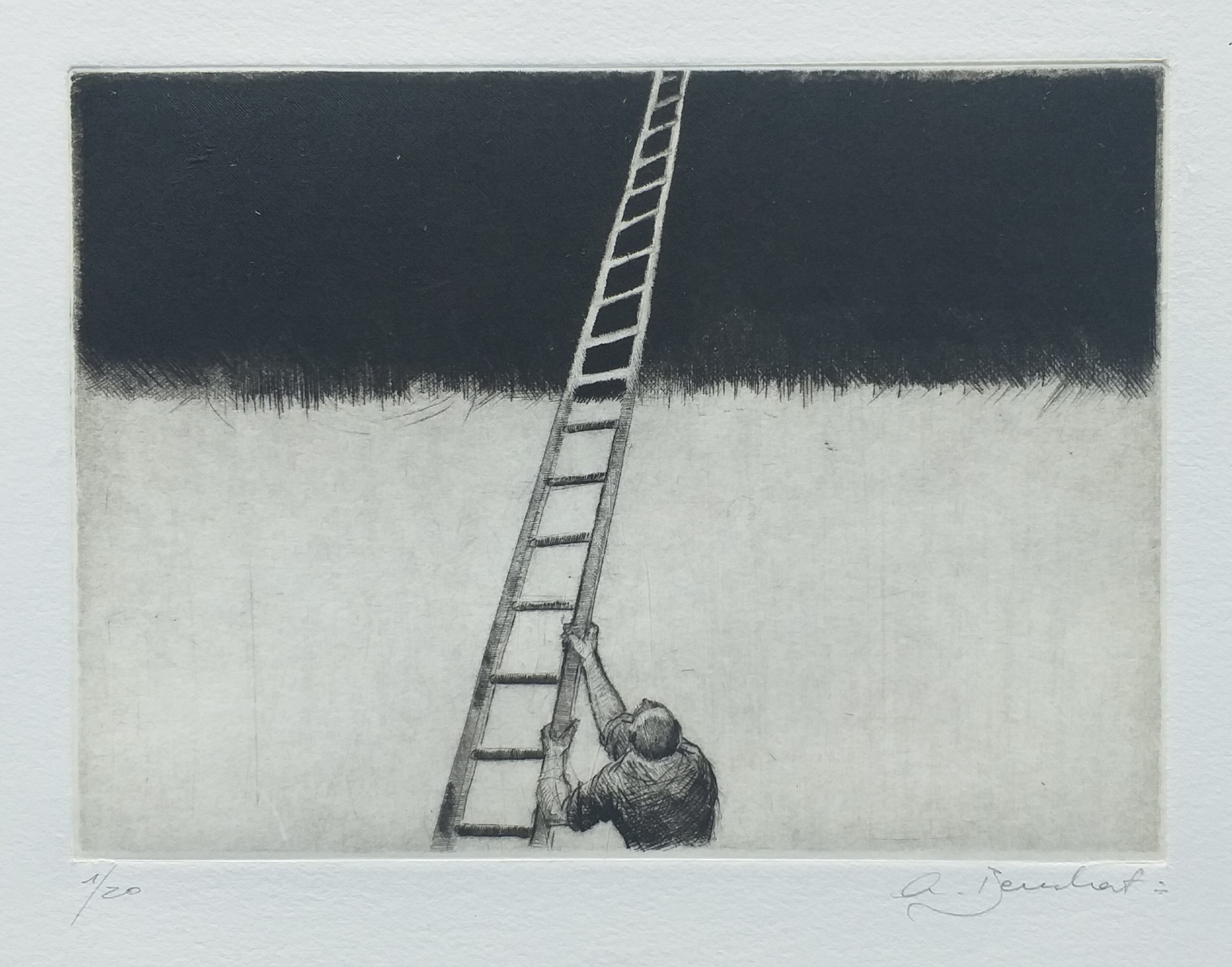 A singular drypoint! In an elementary composition, black and white boldly clash. A small figure—where does he come from?—balances a ladder (a reference to the story of Jacob described in Genesis). What an elegant diagonal traverses the space! This attempt to connect earth to heaven seems bizarre, but the image is symbolic: man loves to challenge nature and push the limits of possibility. The artist also sees in it a desire to establish a connection between the human and the divine. The drypoint reveals sumptuous blacks, and the background applied to the white paper enhances the rigorously executed line.