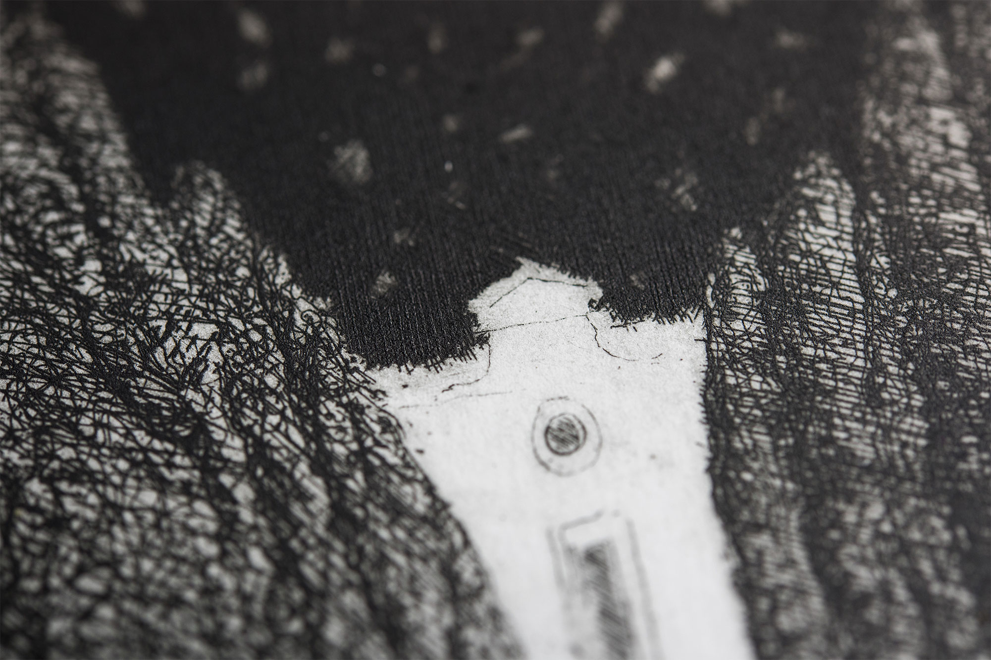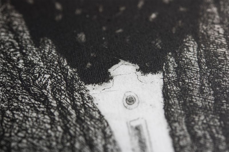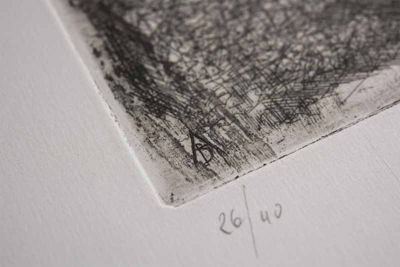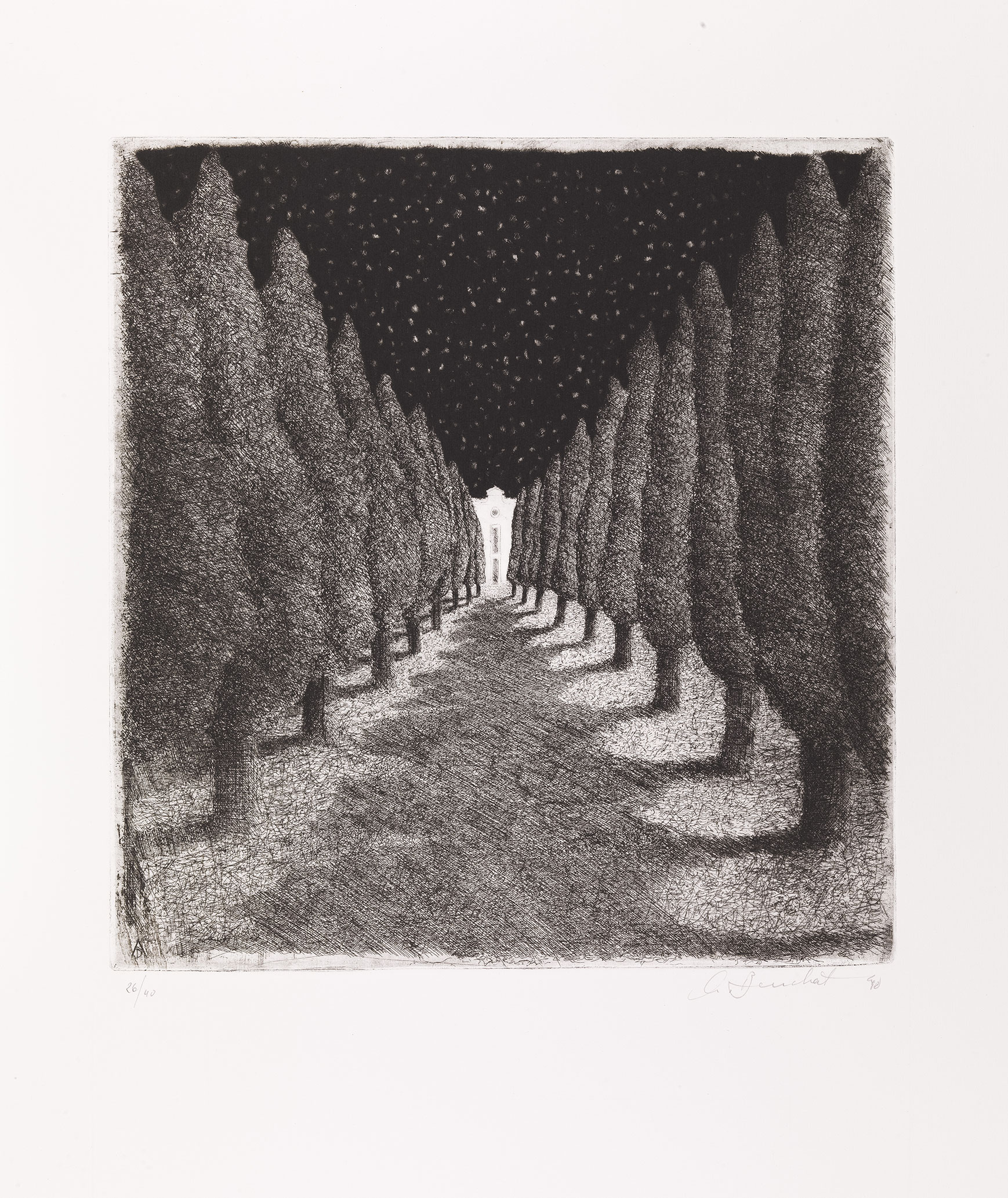 La casa-desiderio è un viaggio onirico condotto in piena libertà ma con un disegno prospettico ben studiato. In un paesaggio sereno dove tutto è immobile, il nostro occhio è catturato dalla vista di un casa lontana. E’ quest’ultima, al centro della composizione, che attira la nostra attenzione. Come prodotto del nostro sogno, essa ci interroga e provoca un’ illusione ottica dovuta al contrasto tra la luce e l’oscurità che la circonda. Il biancore della casa, ravvivato dalla notte, accende il desiderio di raggiungerla. Come per la falena, sogniamo di prenderne possesso ma, non essendo accessibile, la casa desiderio resta un mistero. In un tracciato armonioso all’acquaforte e alla puntasecca, gli alberi si amalgamano delicatamente con le loro ombre come le stelle con il cielo.