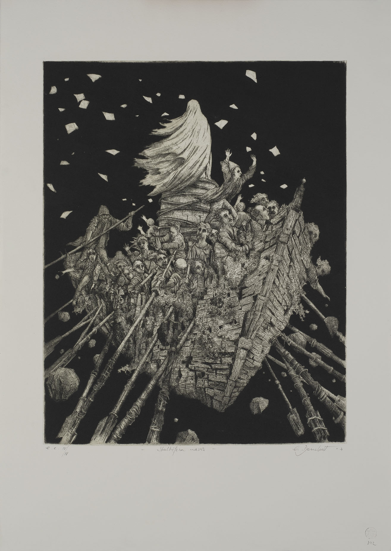 Questo rame inciso si ispira all’opera di Sebastien Brant( Das Narrenschiff, edizione pubblicata a Basilea nel 1494 con illustrazioni di Albrecht Dürer). Nella sua opera, l’autore descrive il viaggio surreale di una nave e di un equipaggio che si comporta in un modo insensato. In questa sontuosa incisione che ha richiesto lunghi mesi di lavoro, nessun allegoria satirica ma una metafora dell’umanità in cammino. L’apparizione di questa imbarcazione che viene verso di noi è sorprendente. Non vi colpisce la curiosa costruzione? Con quei remi che la fanno assomigliare ad un insetto, la vecchia galea ci trascina in un’atmosfera stupefacente e indefinibile. Cosa ci fa nel vuoto cosmico dove sembra fluttuare senza peso? E’ un’audace traversata nelle tenebre siderali o un vagare senza speranza? Chi sono questi personaggi dalle espressioni così singolari? Degli allucinati, dei matti da legare o degli idioti? Nella parte superiore di questa composizione piramidale emerge un’imponente statua su un piedistallo. Rappresenterà la Ragione? Che ruolo tragico...Velata, non può determinare la posizione né orientare la navigazione. Rappresenterà la Fede perduta, un idolo o un santo protettore abbandonato dai fedeli? O forse l’immagine dell’Amore cieco? L’amore è un uccello ribelle che spinge i suoi adepti a saltare da un ostacolo all’altro...Le domande rimangono senza risposta perché l’incisore non fa appello al linguaggio dell’intelligenza ma alla sensibilità del pensiero. Gli effetti sono impressionanti, ciononostante questa armonia dei toni e dei contrasti non è solo per il piacere degli occhi. Frutto di un lavoro creativo, il rame libera sulla carta interrogativi, dubbi e, quando si insinua la gioia, emozioni profonde. La nave dei folli raccoglie una frotta di uomini in un viaggio immaginario. Attraverso l’incisione siamo anche noi trascinati in un mondo “altro”, più vicino, in un certo modo, allo spirito. Via salvifica o tentativo di scappare dalle miserie umane?