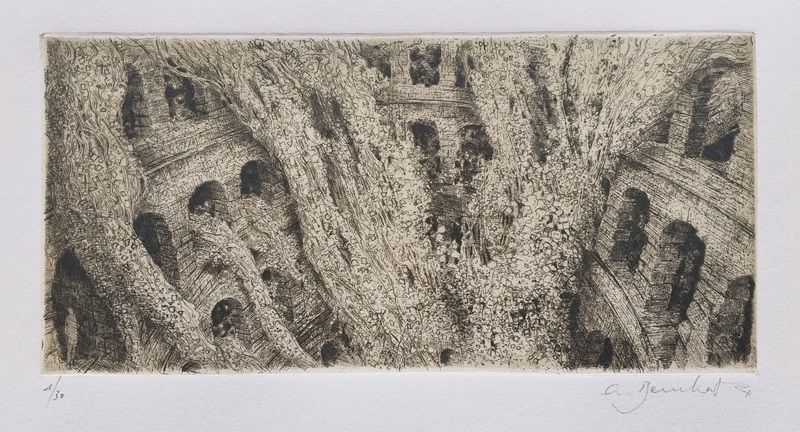 Il nostro sguardo si immerge in un’arena antica semisepolta da una vegetazione lussureggiante. Fra i vari ordini di archi in pietra, l’intreccio sinuoso di curve e controcurve offre una visione caotica. L'arena, nata per gli uomini, si trasforma e rinasce. La linfa è il nuovo sangue e questo magma vegetale, seguendo regole nuove, è animato da una bellezza selvaggia. Tra i numerosi dettagli che nutrono la nostra immaginazione, è da menzionare il piccola personaggio che contempla, all'ombra delle pietre in fiore, un paesaggio ammaliante.
